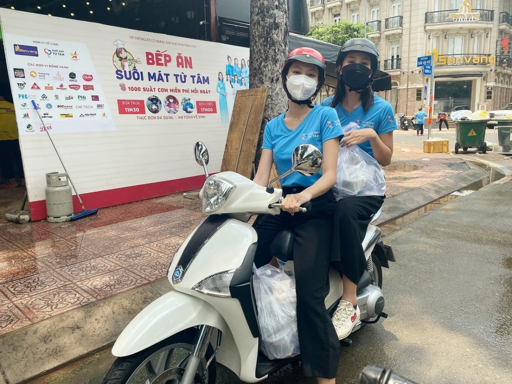 Hoa hậu Tiểu Vy và Á hậu Ngọc Thảo tự lái xe máy làm tình nguyện viên giao cơm cho chiến sĩ lực lượng tuyến đầu. Ảnh: Fanpage Suối mát Từ tâm.
