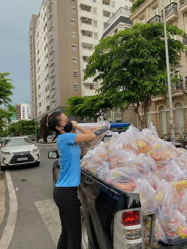 Nữ diễn viên và ông xã cũng đã vận chuyển và phân phát số lương thực, rau củ cho một số nơi như chùa Long Hoa - Trung tâm bảo trợ và nuôi dưỡng trẻ mồ côi Long Hoa, bếp quận 7, bếp công nhân quận 8 và một số hộ dân cũng như công nhân trong khu cách lý phường Tân Xuân Đông.