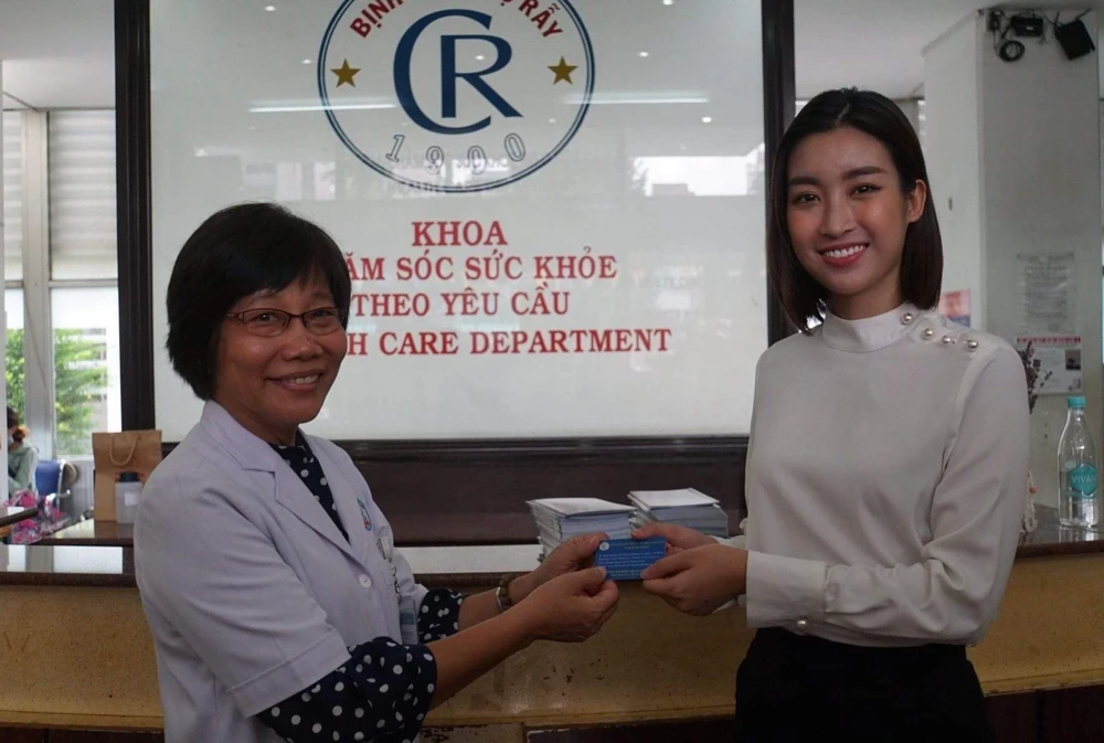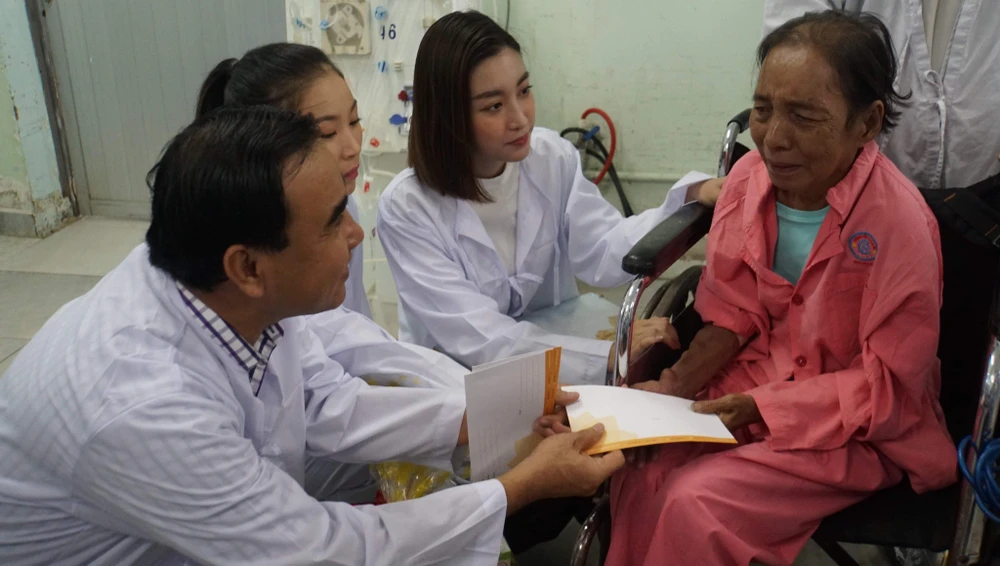 Hoa hậu Đỗ Mỹ Linh cùng MC Quyền Linh và các thí sinh trong dự án Người đẹp nhân ái thăm hỏi các bệnh nhân Khoa thận Nhân tạo BV Chợ Rẫy. Ảnh: HL
