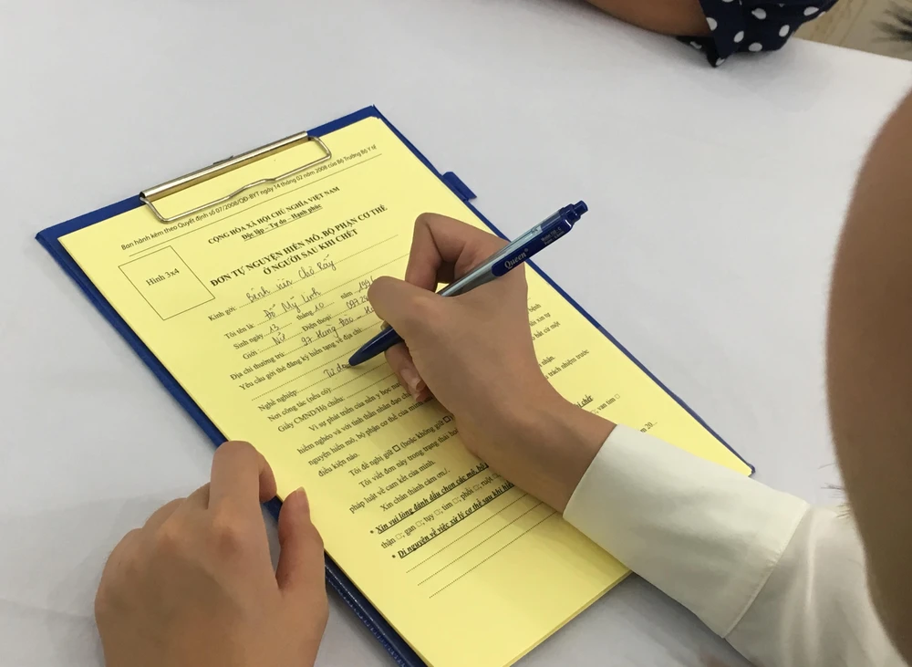 Hoa hậu Đỗ Mỹ Linh đặt bút điền vào đơn đăng ký hiến tạng. Ảnh: HL