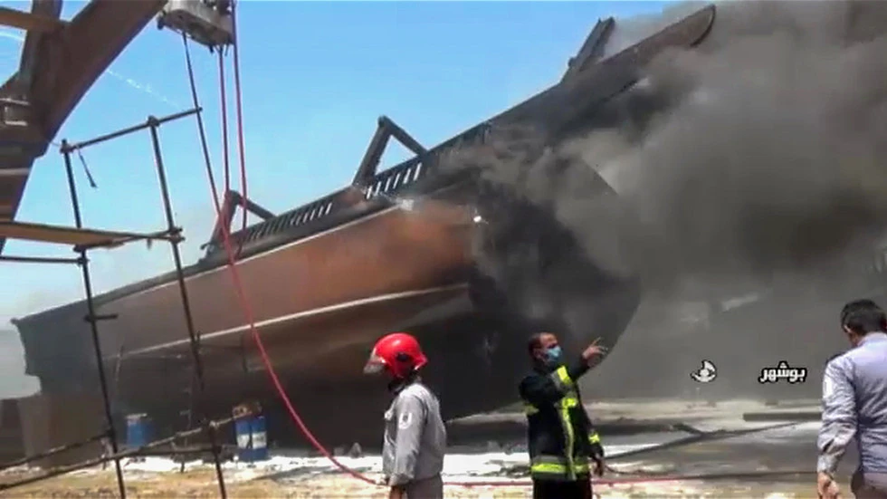 Lính cứu hỏa đang dập lửa tại nhà máy thuyền Delvar Kashti Bushehr ở thành phố Bushehr của Iran. Ảnh: AFP/IRIB/RT