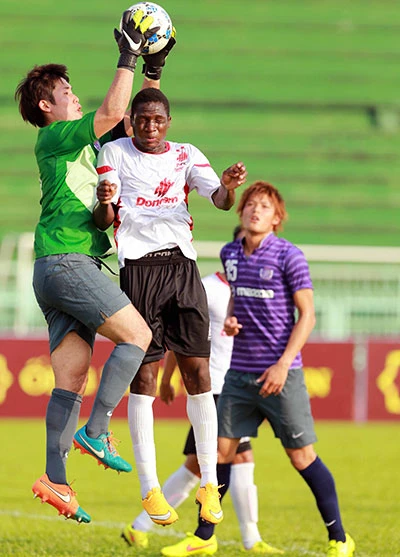 Pha không chiến giữa tiền đạo ĐT Long An với thủ môn người Nhật. Ảnh: XUÂN HUY