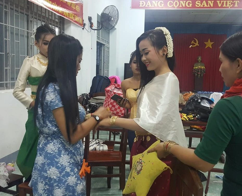 Chhuck Savy cùng các thí sinh người Campuchia trong hậu trường chuẩn bị cho đêm thi đầu tiên. Cô có nụ cười răng khểnh rất ngọt ngào. Ảnh: HỒNG MINH.