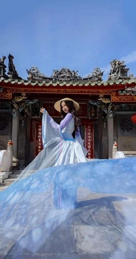 Nếu như Đoàn Hồng Trang muốn tôn vinh vẻ đẹp thuần Việt thì áo dài của NTK- Họa sĩ- Nghệ nhân Trung Đinh là lựa chọn tuyệt vời để vẽ nên bức tranh tuyệt đẹp đó giữa phố cổ Hội An cổ kính.