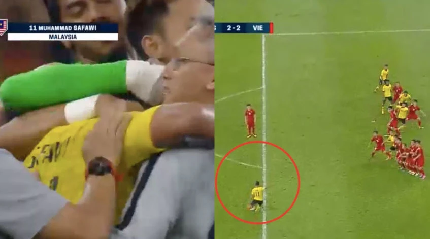Phút 90+1, từ quả đá phạt trực tiếp từ cự ly rất xa, bóng được treo vào và cầu thủ Malaysia đã phạm lỗi với Văn Lâm.