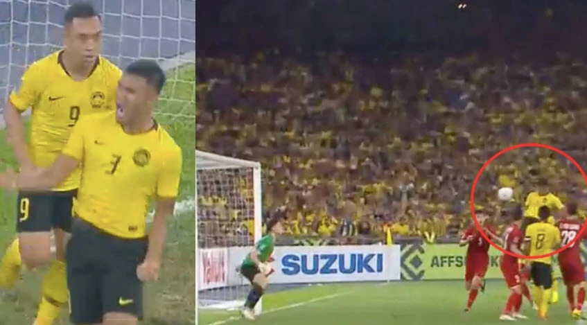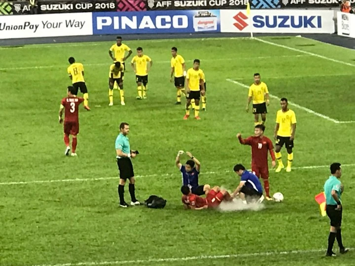 Phút 30, Quang Hải thực hiện quả đá phạt chạm hàng rào Malaysia, các cầu thủ Việt Nam cho rằng bóng đã chạm tay cầu thủ chủ nhà nhưng trọng tài vẫn cho trận đấu tiếp tục.