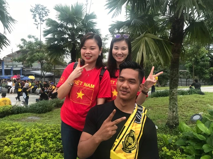 CĐV Việt Nam và Malaysia chụp ảnh chung cùng nhau. ẢNH: CÔNG TUẤN.