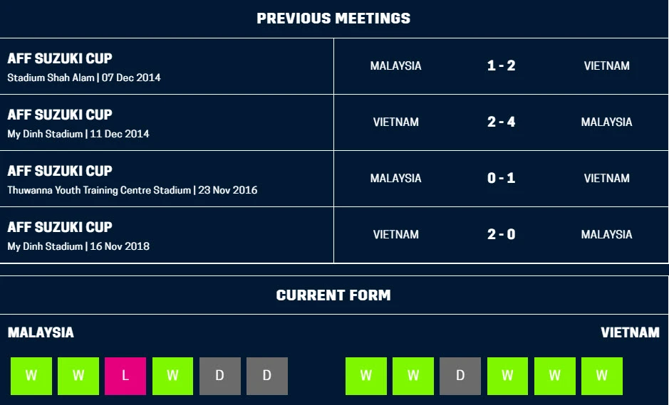 Xa hơn một chút, SEA Games năm 2009, Việt Nam cũng từng hạ gục Malaysia đến 3-1 ở vòng bảng nhưng vào chung kết lại thua đau chính Malaysia 1-0 cay đắng nhìn đối thủ một lần nữa đăng quang. Gần đây nhất, các cầu thủ Malaysia hòa Thái Lan trên sân nhà 0-0 ở lượt đi vòng bán kết nhưng trên sân khách, họ xuất sắc cầm hòa người Thái 2-2 để lọt vào chung kết gặp Việt Nam.