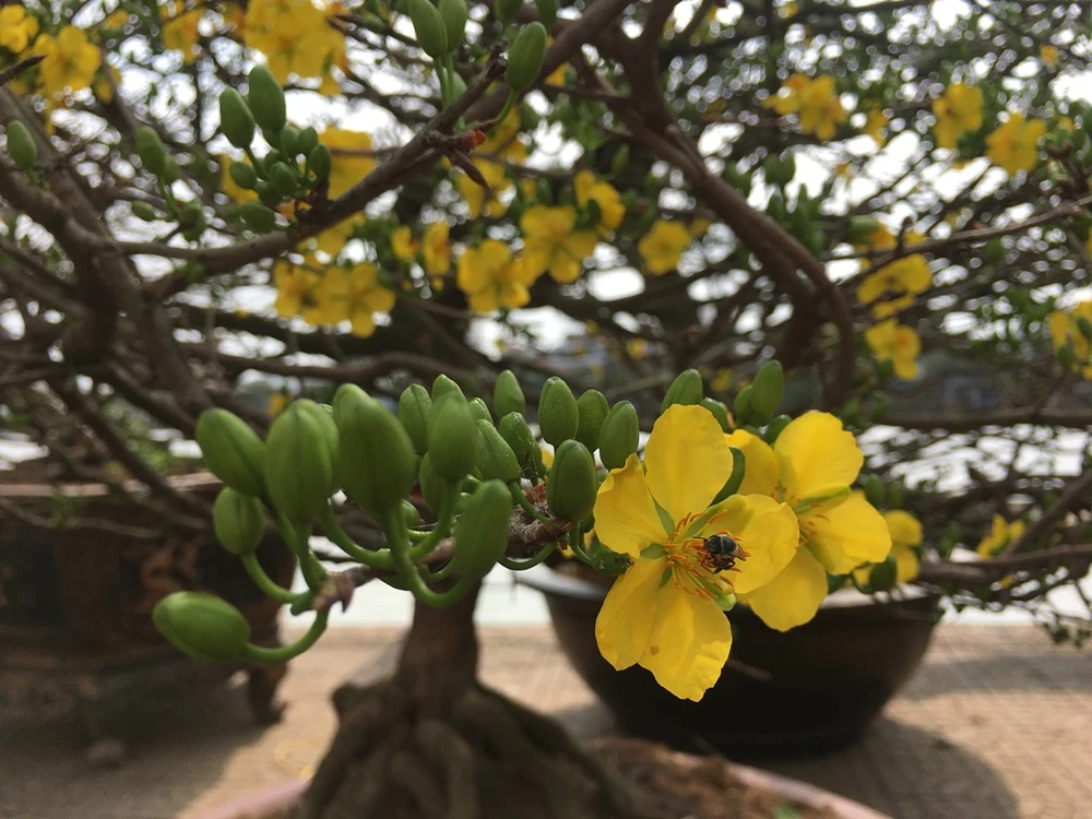 Một cây mai đã trổ bông rất đẹp cạnh bờ hồ Xáng Thổi. Mai được người bán rao từ 2-5 triệu/cây với nụ mới đơm hoặc đang bóc mày, cây có tán rộng tầm 1m , cao khoảng 1,1m-1,3m. Ảnh: NN
