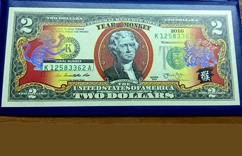 Tiền 2 USD in hình con khỉ được đặt trong hộp bằng da đang rao bán giá 450.000 đồng/tờ. Ảnh: yên trang