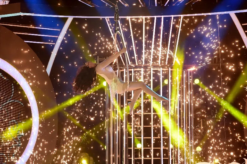 Cô phải hát tiếng Ấn Độ với tiết tấu nhanh và cách phát âm khác lạ. Ngoài ra cô cũng phải ngồi lên một vòng tròn để được đưa lên cao trong quá trình biểu diễn. Ảnh: Lý Võ Phú Hưng - Sóng Vàng