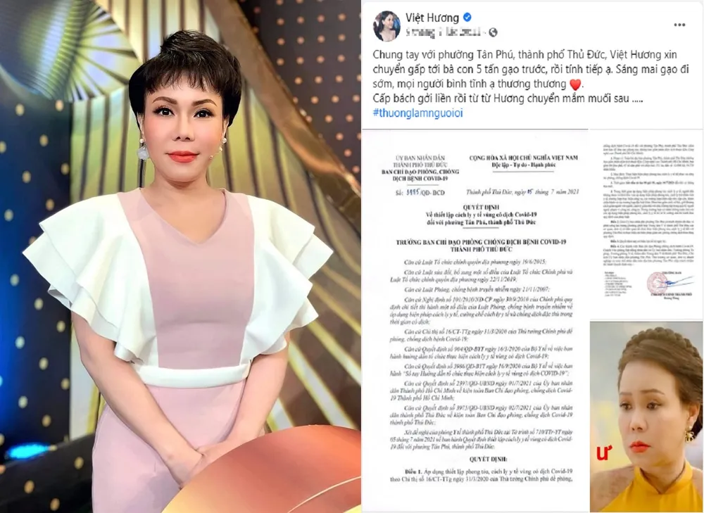Nữ nghệ sĩ cho biết: “Chung tay với phường Tân Phú, thành phố Thủ Đức, Việt Hương xin chuyển gấp tới bà con 5 tấn gạo trước, rồi tính tiếp ạ. Sáng mai gạo đi sớm, mọi người bình tĩnh ạ. Thương thương. Cấp bách gởi liền rồi từ từ Hương chuyển mắm muối sau…”.
