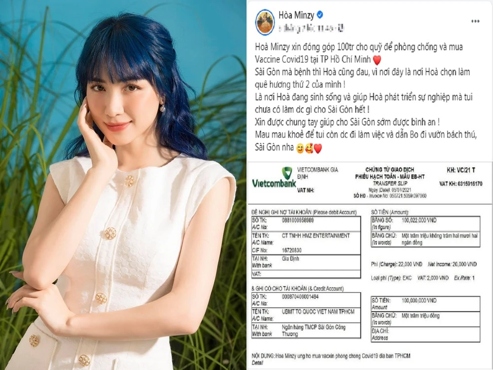 Trên trang cá nhân của mình, Hòa Minzy đã đăng tải hình ảnh và cho biết bản thân gửi tặng 100 triệu đồng Quỹ Vaccine phòng chống dịch COVID-19 của TP.HCM.