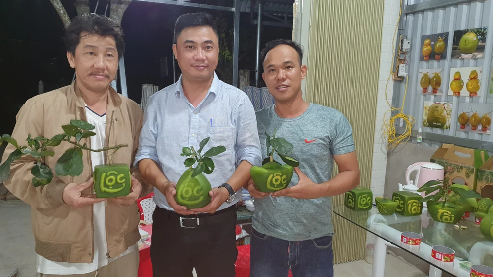 Ông Huỳnh Thanh Tâm, nhà vườn ở Bến Tre, thông tin: Bưởi hoa mai in chữ tài lộc và bưởi đồng tiền in chữ tài lộc là hai sản phẩm mới lần đầu tiên được ông tung ra thị trường tết năm nay. Hai sản phẩm này giá dao động từ 800.000 đồng đến 1,2 triệu đồng/trái.