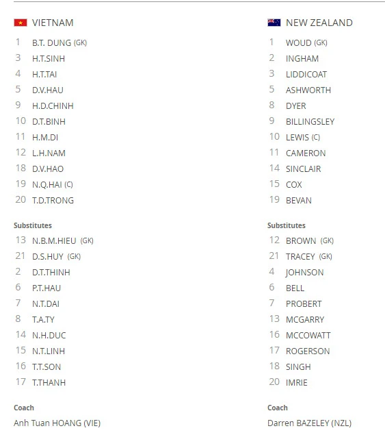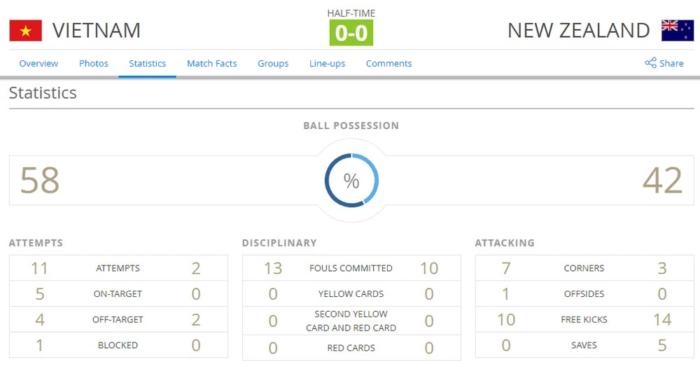 Trong khi đó, U-20 New Zealand chỉ có 2 cút sút nhưng không trúng mục tiêu. Ngoài ra Việt Nam được hưởng đến 7 quả phạt góc so với 2 của New Zealand.