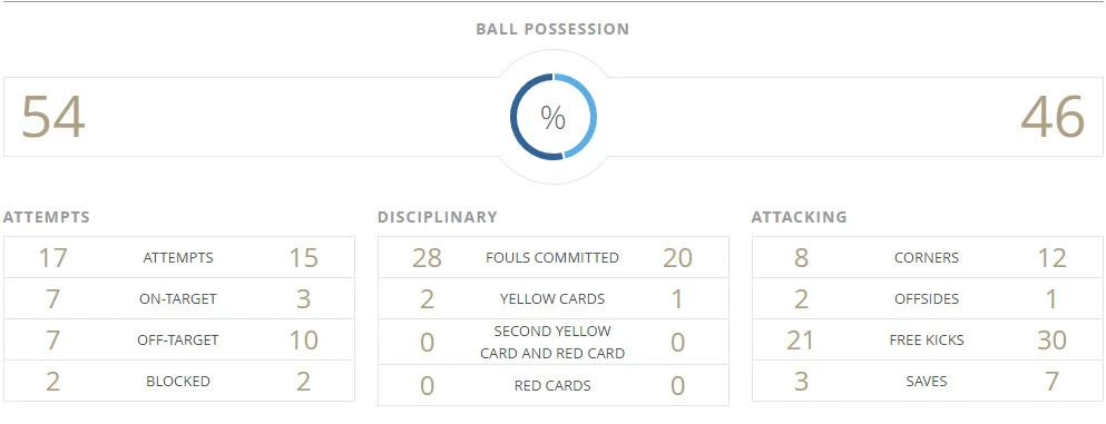 Các con số thống kê đã nói lên sự vượt trội của học trò HLV Hoàng Anh Tuấn trong 45 phút đầu trận. U-20 Việt Nam cầm đến 58% bóng, tung ra 12 pha dứt điểm trong đó có 5 đi trúng đích.