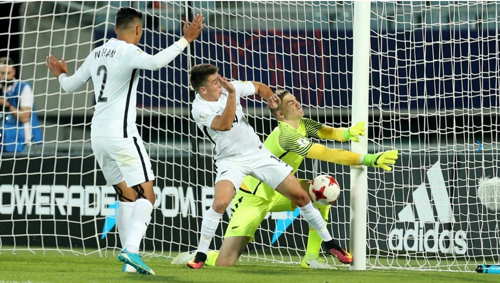 Phút 90, cầu thủ New Zealand có pha đánh đầu ngược lái bóng rất hay, bóng đi ra ngoài trong gang tấc.