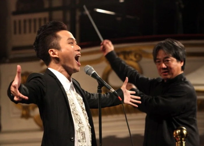 Tùng Dương phối hợp ăn ý với nhạc trưởng người Nhật Bản - Honna Tetsuji - cùng Dàn nhạc giao hưởng Việt Nam.Ảnh VNE