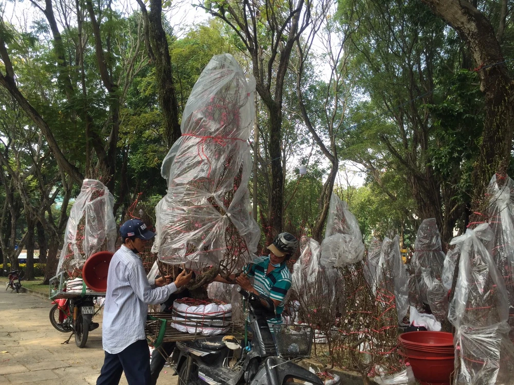 Một chậu đào có giá 3 triệu đồng người bán tại công viên Lê Văn Tám chuẩn bị giao cho khách.