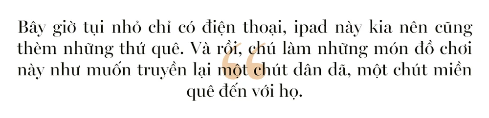 Bây giờ đồ chơi nhiều, mà toàn đồ điện tử không thôi, nên chú nhớ đến tuổi thơ của mình và làm lại cho những đứa nhỏ có thứ để chơi”, ông Minh chia sẻ.