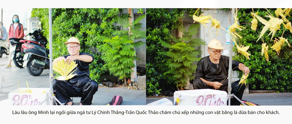 Đến 19 giờ tối, trong khoảng sân vườn nhà mình, ông Minh lại tay cắt, tay bấm lá dừa, kiên nhẫn, tỉ mỉ từng tí một để tạo nên những sản phẩm để mai đem đi bán ngoài phố. Người Sài Gòn dường như đã quen với ông, quen với một người cần mẫn làm những món đồ tuổi thơ để đem lại niềm vui cho nhiều đứa trẻ ở phố.