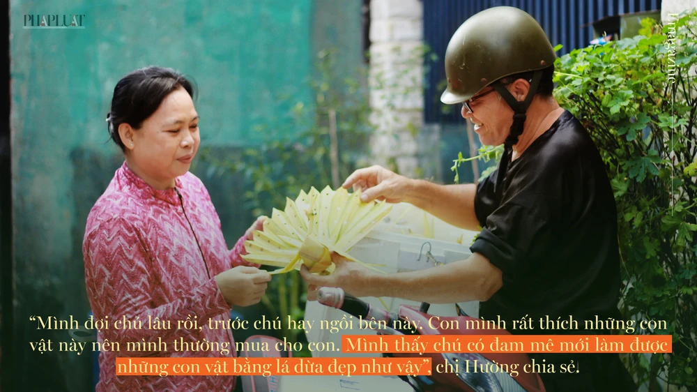 Từ ngày “gác cọ” vì đôi mắt yếu đi không thể vẽ, ông Minh bắt đầu những ngày rong ruổi khắp các ngõ ngách Sài Gòn để “sáng tạo” những mẫu hình từ lá dừa bán cho khách. Có một điều lạ là, nhiều người cứ hay nói đùa rằng gặp ông để mua những con vật làm từ lá dừa để gợi về tuổi thơ, ví như ông đi…bán tuổi thơ, nhưng ông Minh cười xòa, bảo không phải.
