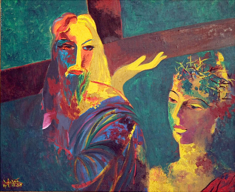 Tác phẩm "Đôi bạn chân tình" vẽ về Chúa Jesus và Phật của Lê Đại Chúc với chất liệu acrylic trên vải vẽ. Ảnh: Nhân vật cung cấp