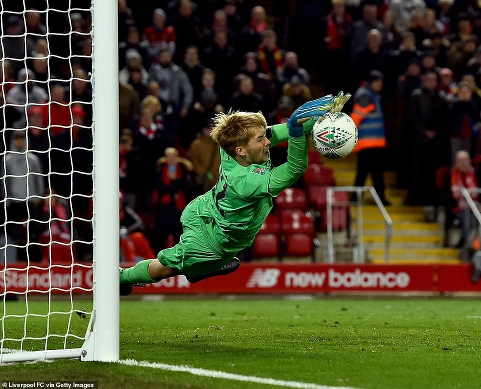 Thủ môn trẻ Kelleher bắt phạt đền thành công cú sút của Ceballos, giúp Liverpool vào tứ kết Cúp Liên đoàn.