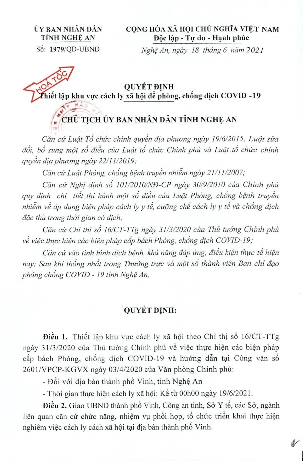 Quyết định nêu rõ: “Thiết lập khu vực cách ly xã hội (theo Chỉ thị số 16 của Thủ tướng Chính phủ) đối với địa bàn TP Vinh, tỉnh Nghệ An. Thời gian thực hiện cách ly xã hội kể từ 0 giờ 0 phút ngày 19-6-2021”.