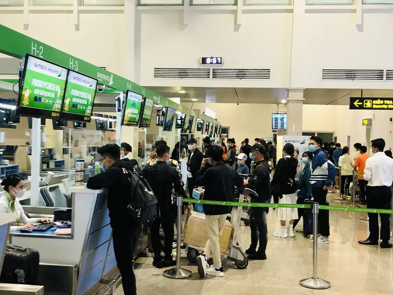 Lượng khách xuất phát từ Cảng HKQT Tân Sơn Nhất khá đông đúc. Khu vực tầng một, sảnh ga quốc nội khách bay các hãng Vietnam Airlines, Pacific Airlines và Bamboo Airlines xếp kín khu vực chờ làm thủ tục an ninh. Theo đó, nhân viên an ninh nhiều lần nhắc nhở, khách tiễn rời khu vực này để đảm bảo thông thoáng, khách đến sau có khoảng cách vào xếp hàng chờ làm thủ tục.