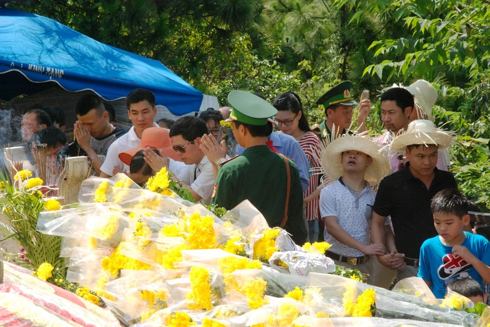 Tại khu vực bãi đổ xe, dòng người xếp hàng thành hai hàng ngay ngắn, trên tay cầm những bó hoa tươi trật tự, chậm bước nối tiếp nhau, từ từ tiến lên bên khu mộ Đại tướng thành kín dâng lên trước mộ những nén tâm hương.