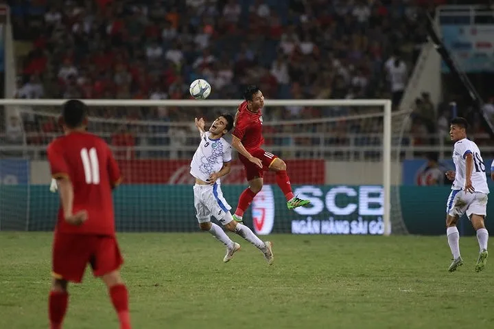 Phút 16, từ quả đá phạt, Xuân Trường treo vào chuẩn xác cho Anh Đức đánh đầu nhưng bóng đi ngay vào tay thủ thành Dilshod.