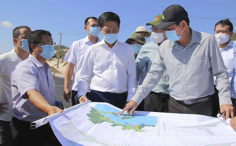 Ông Trần Tuấn Anh, Ủy viên Bộ Chính trị, Trưởng Ban Kinh tế Trung ương cùng đoàn công tác Trung ương thị sát khu kinh tế Van Phong. Ảnh: THÁI BÌNH
