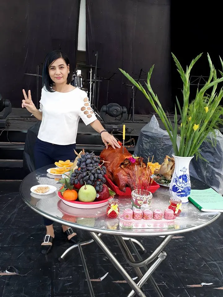 Nghệ sĩ - bà bầu Cát Phượng cúng heo quay tập tuồng liveshow Hoài Linh Chú lùn và bảy nàng Bạch Tuyết.