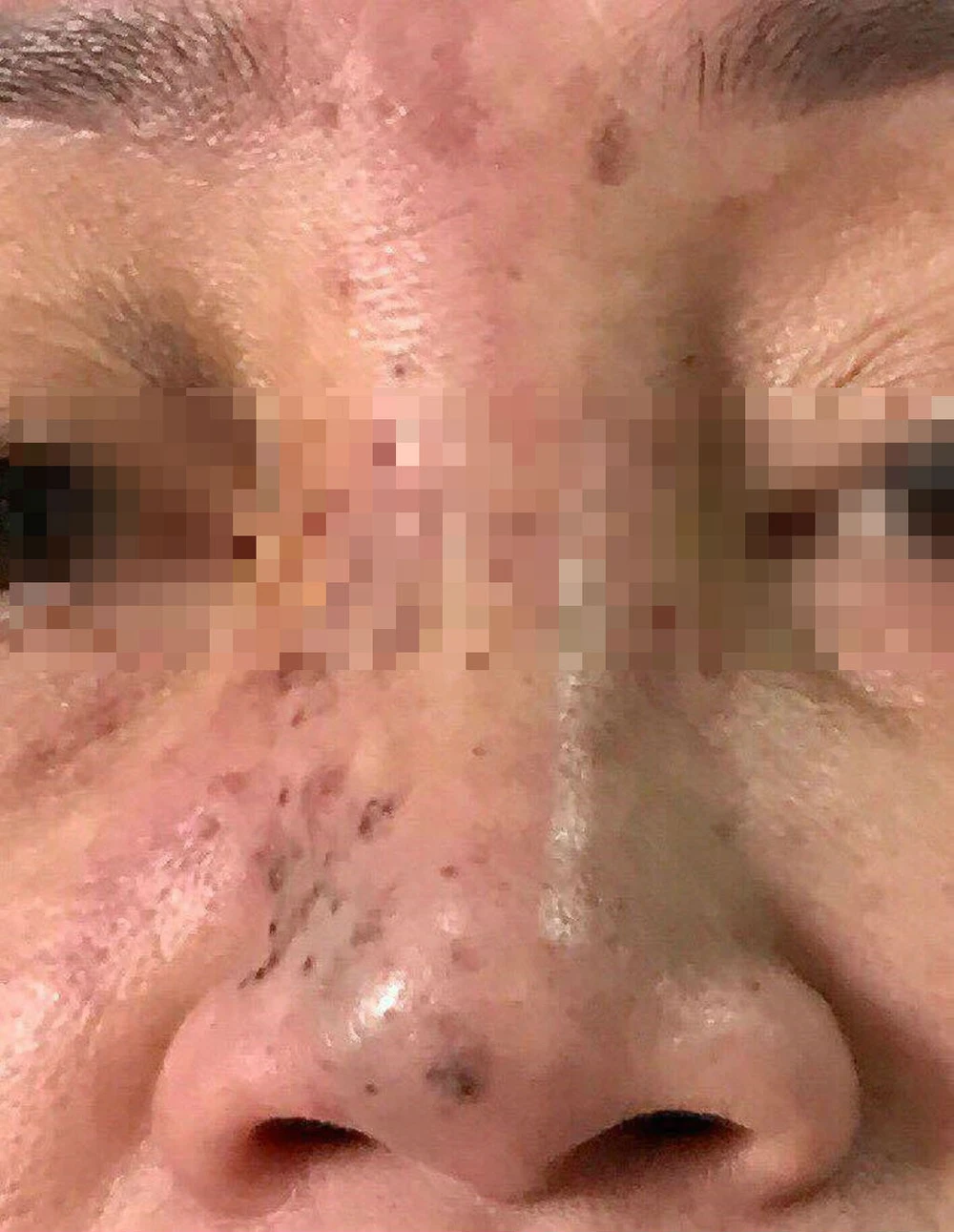 Bệnh nhân nữ thứ nhất (49 tuổi) dù khi tiêm chất làm đầy mũi đã cẩn thận tìm đến cơ sở thẩm mỹ được cấp phép nhưng sau khi tiêm chất làm đầy vẫn gặp sự cố. Ban đầu bà chỉ cảm thấy nhức vùng mũi, mắt, liên tục chóng mặt, nhưng khi vào BV Trưng Vương khám, trên mặt bà đã xuất hiện những vết hoại tử lốm đốm khiến bà vô cùng hoảng sợ.