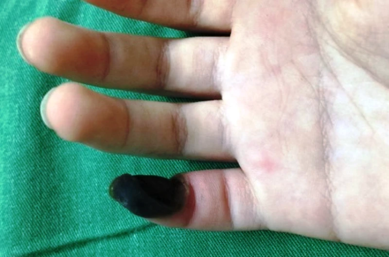 Ngón tay bé T. khi nhập viện đang bị hoại tử. Ảnh: BV Sản nhi Nghệ An.