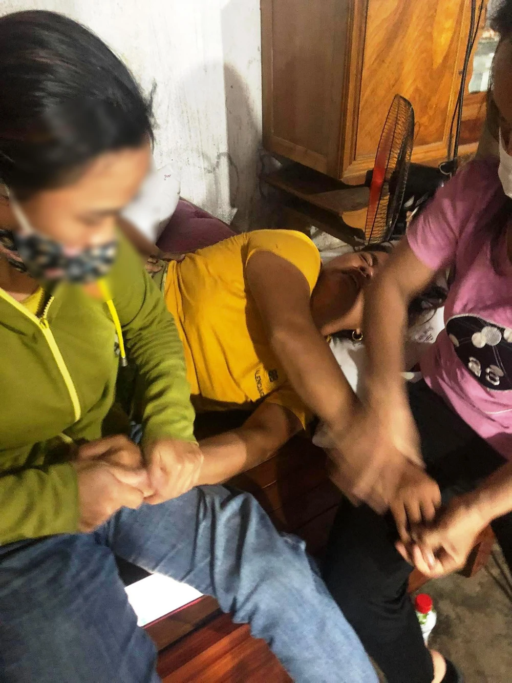 Chị Nhung ôm ba con, òa óc. Chị ngất xỉu. Các con hốt hoảng, khóc, gọi tên bố. Bà con, anh em, lối xóm sang giúp đỡ, động viên.