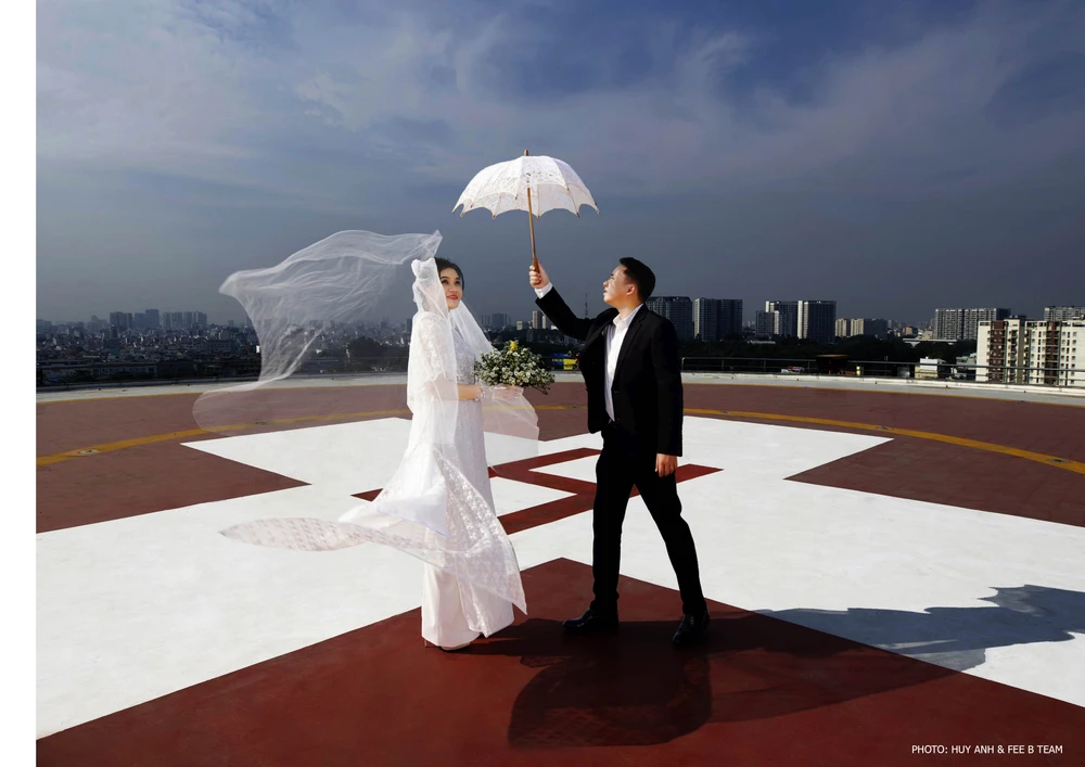 Hình cưới của một cặp đôi trên sân trực thăng tòa nhà Viện Chấn thương Chỉnh hình BV Quân y 175. Ảnh: BVCC