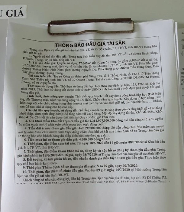 Đến ngày 9-7, Trung tâm Dịch vụ đấu giá tài sản có văn bản về việc trong thời gian niêm yết có hai khách hàng tới tham khảo và mua hồ sơ tham gia đấu giá.