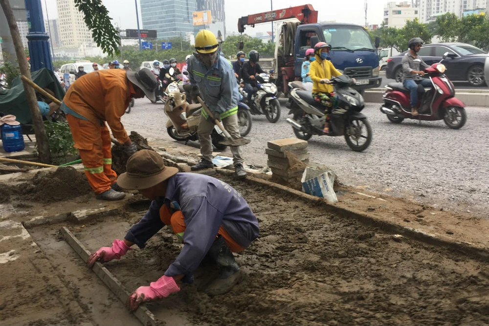 Các đoạn đã có nền hạ đang được gấp rút trải xi măng để lát gạch vỉa hè.