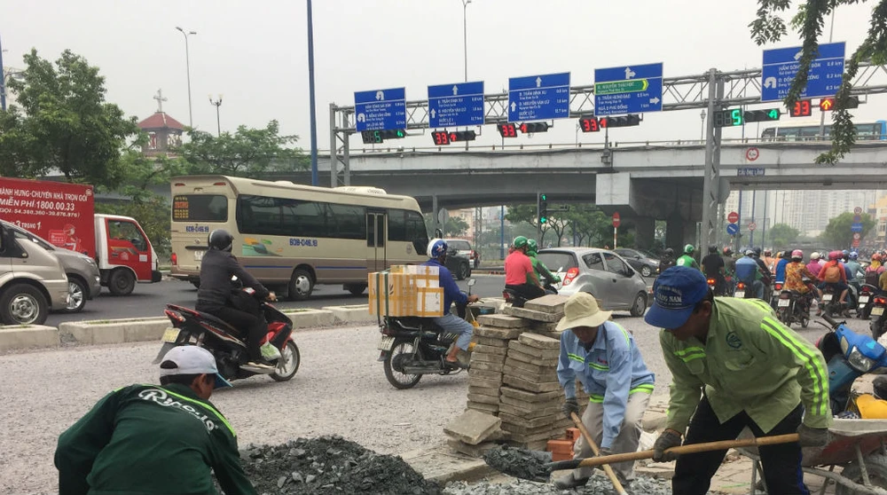 Trong chiều 28-12, các đơn vị thi công gấp rút trải đá làm nền hạ cho vỉa hè.