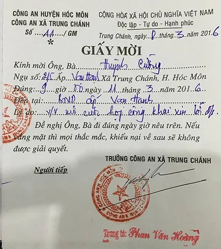 Giấy mời ông Huỳnh Cường đến dự buổi xin lỗi công khai của Công an xã Trung Chánh, Hóc Môn. Ảnh: HOÀNG GIANG