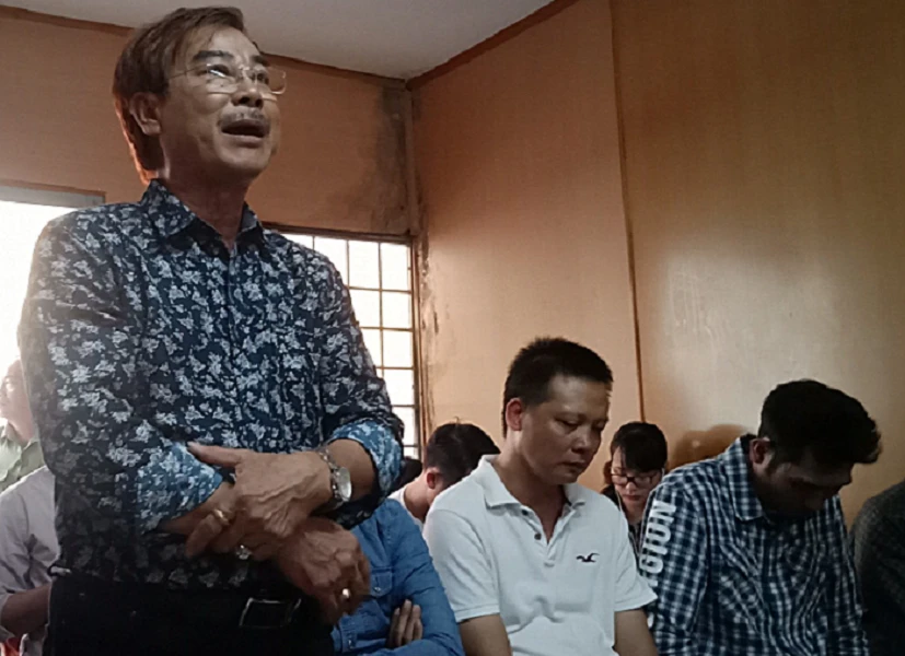Bị cáo Hậu (đứng) cùng đồng phạm tại tòa. Ảnh: CÙ HIỀN