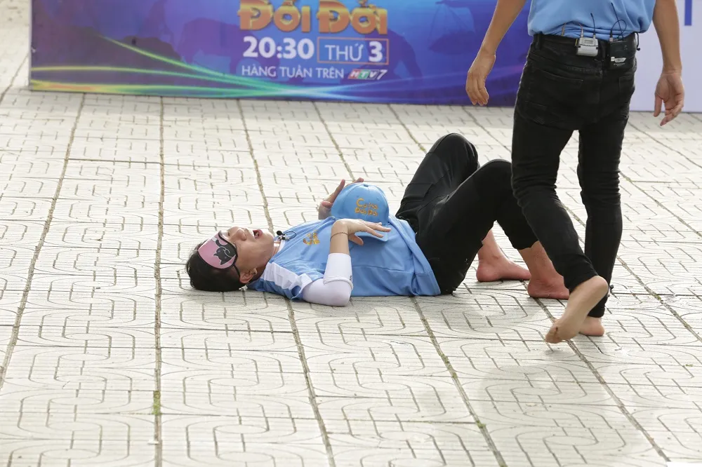 Anh Đức nằm ngửa dưới sân vì đứng quá lâu trong chậu nước đá.