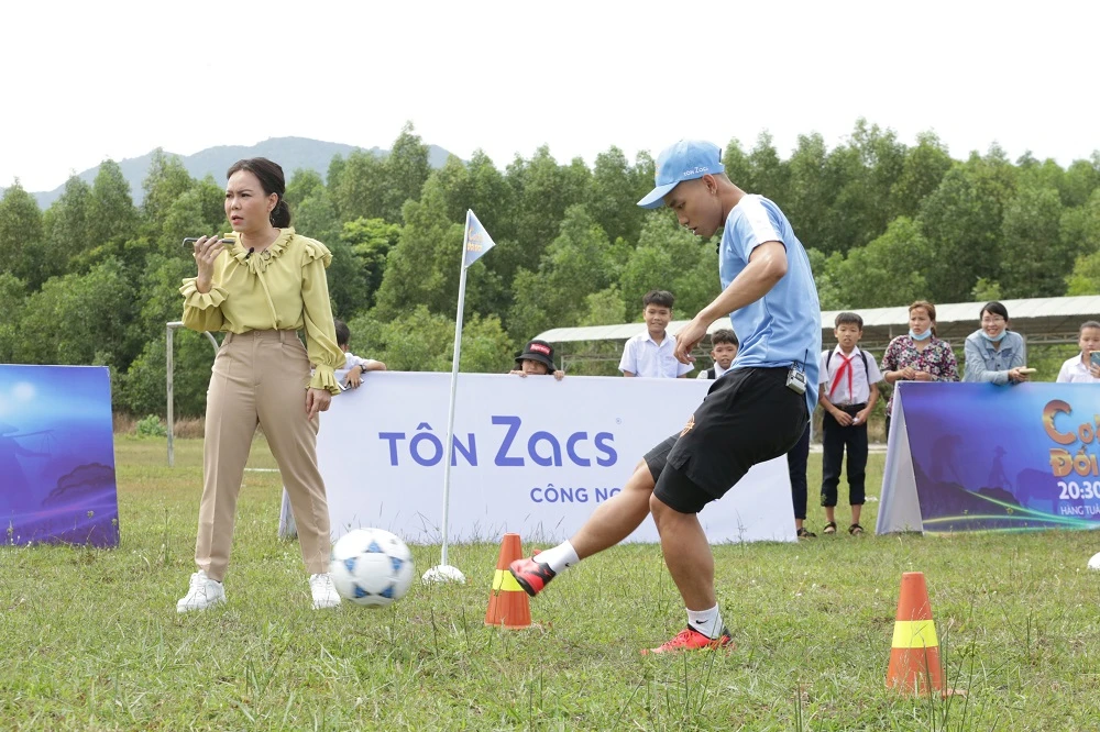 Thử thách cá nhân của Văn Thanh là phải vừa tâng bóng đi dích dắc vừa phải đá được năm trái bóng lọt vào khung thành bằng lốp xe.