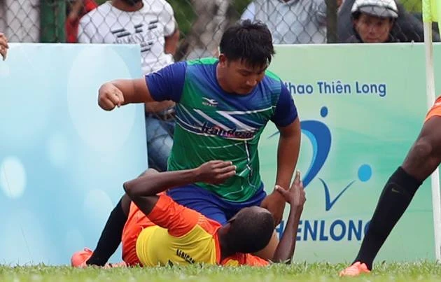 Long "củi" (Trường Giang FC) suýt "tẩn" một cầu thủ của African Team. Ảnh: A. ĐỒNG