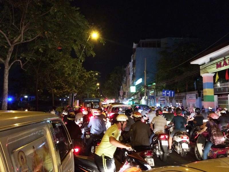 Tuyến đường bị phong tỏa phục vụ công tác chữa cháy nên tạo nên cảnh ùn tắc nghiêm trọng.