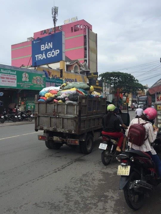 Đây là "hung thần" gom rác với những bao rác, túi rác chất hỗn độn cao hơn rào chắn của xe. Người đi đường sẽ phải ngao ngán và tránh xa vì sợ rác rơi trúng đầu. Ảnh: V. NGUYÊN