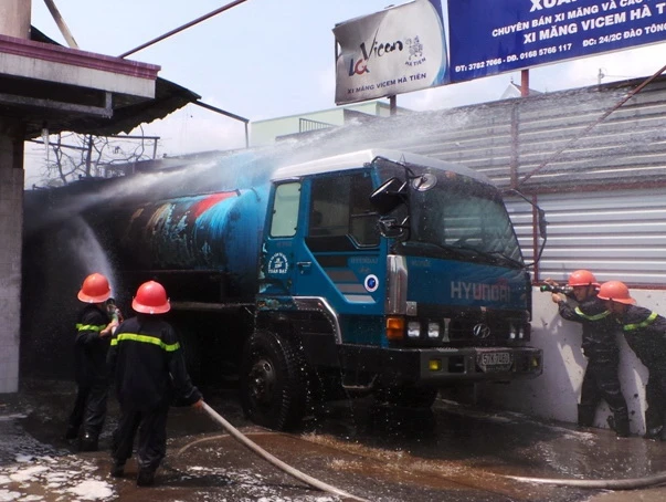 Lính cứu hỏa tiếp cận, ứng cứu xe bồn đang cháy.
