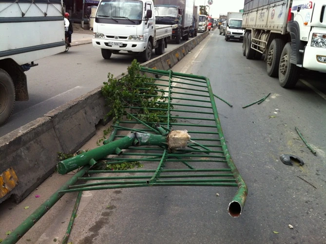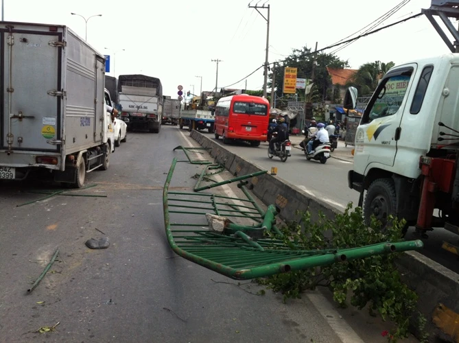 Chiếc xe tải húc sập dải phân cách bằng sắt và kéo lê trên mặt đường.